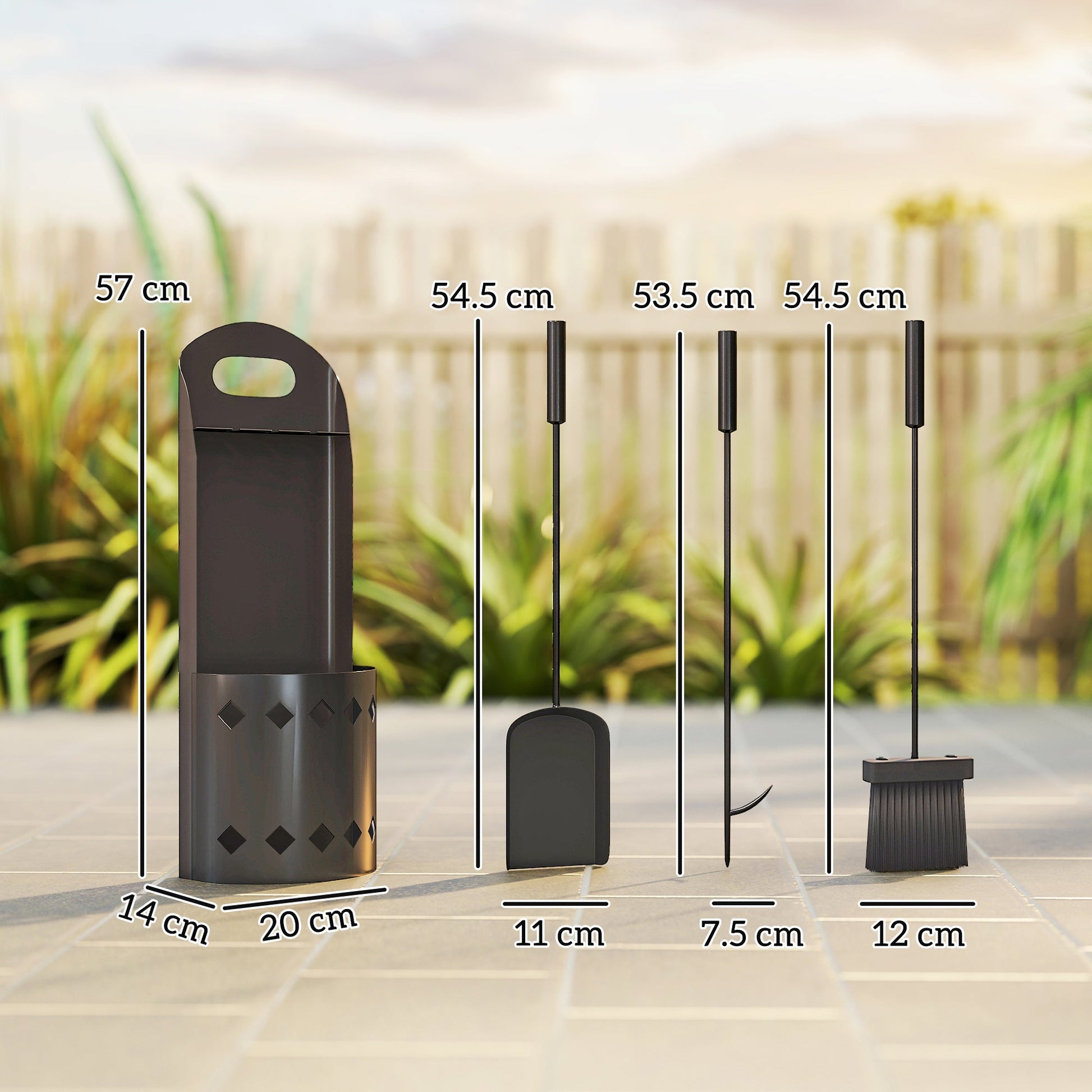- Four-piece set includes a broom, a shovel, a poker and a bucket